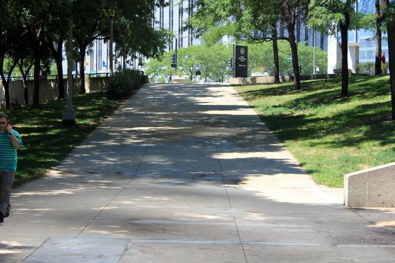 This incline in the "public" sidewalk at 400 Randolph appears to exceed the allowed 5% slope, and should be evaluated by the City of Chicago.